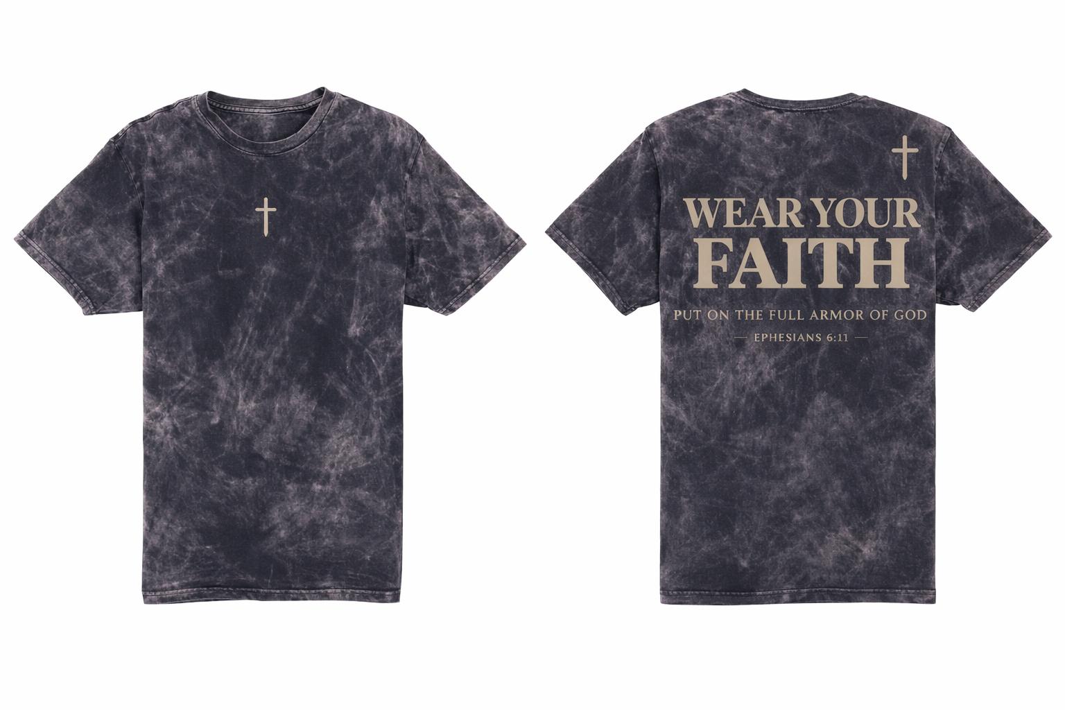 Our Short Sleeve Mineral Wash “Wear Your Faith” Tee blends bold faith with modern street style. Designed with a vintage mineral wash finish, each shirt has a unique washed texture that gives it a worn-in, elevated look. Featuring a minimal front cross and a bold back statement, “Wear Your Faith” with Ephesians 6:11, this piece is a reminder to put on the full armor of God daily. Soft, comfortable, and made to stand out — this is faith you can wear anywhere.